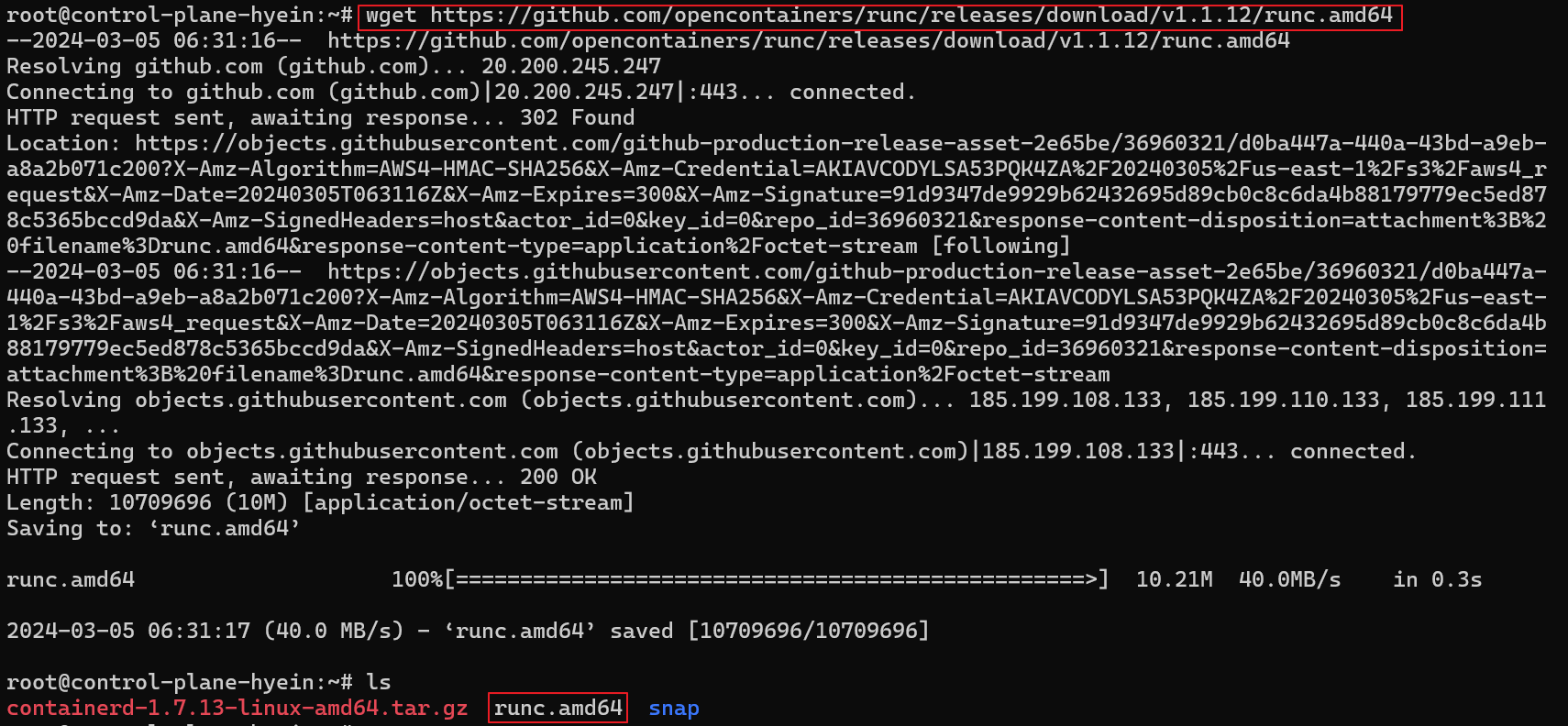 - wget {복사한 링크 주소} 명령어를 입력하여 runc.amd64를 각 [가상 머신]에 다운로드 합니다.