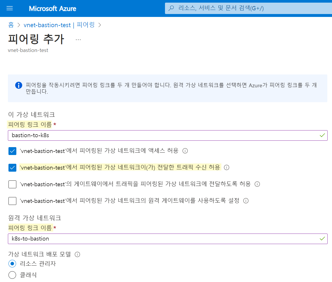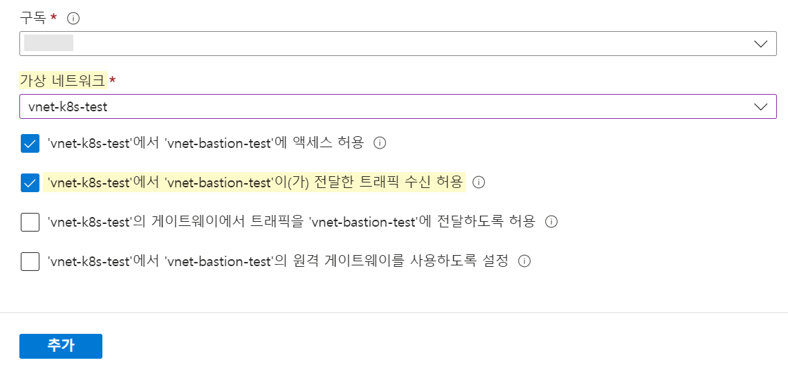 Bastion용 가상 머신은 Kubernetes Cluster를 이루는 가상 머신이 배포된 [가상 네트워크]와 다른 대역에 배포한 후 [VNet Peering]을 진행합니다.