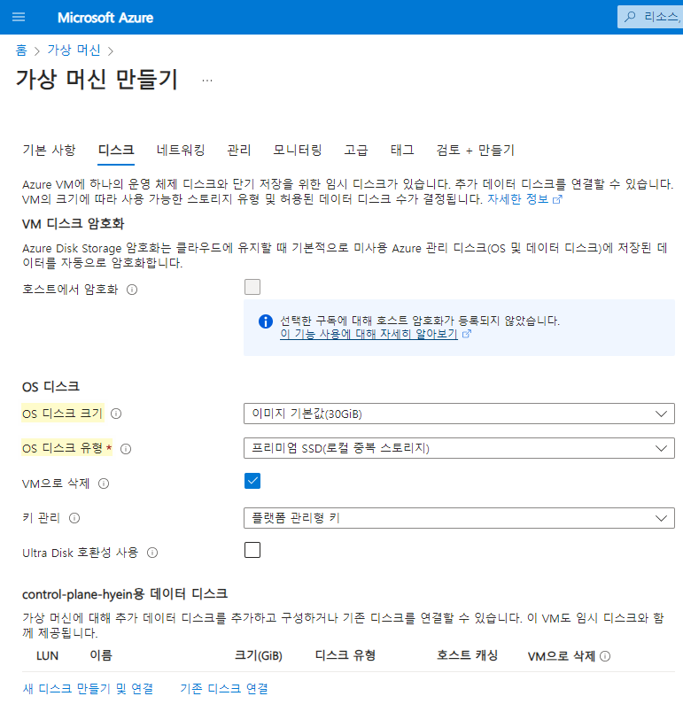 본 테스트에서는 이름만 변경하였으나 필요에 따라 control plane의 역할을 하는 [가상 머신]의 SKU를 더 크게 지정할 수 있습니다.