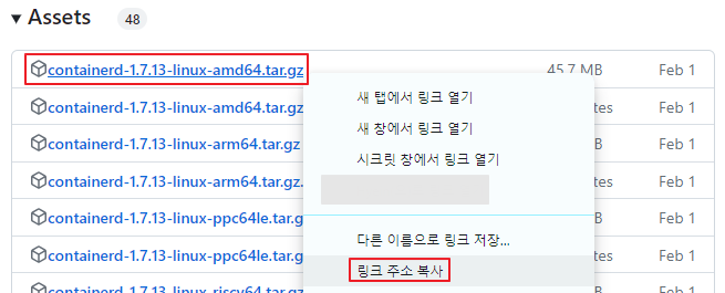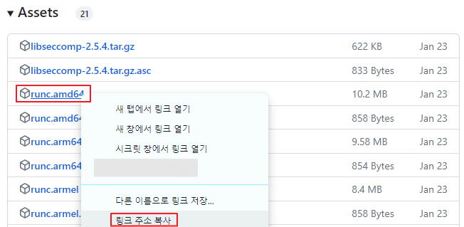 - runc.amd64를 선택한 후 마우스를 우클릭하여 [링크 주소 복사] 버튼을 통해 링크를 복사합니다.