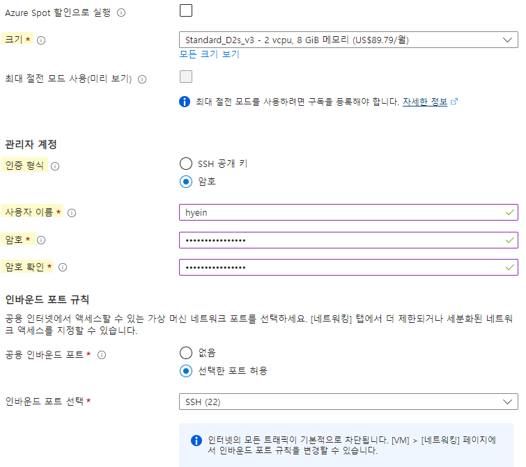 - 영역 : Korea Central # 가상 머신이 배포될 Azure Region 선택