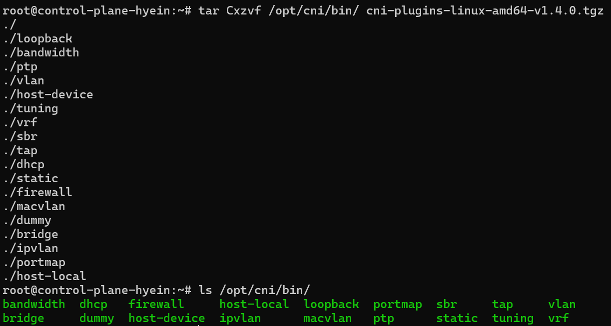 - wget {복사한 링크 주소} 명령어를 입력하여 cni plugin을 각 [가상 머신]에 다운로드한 후 tar Cxzvf /opt/cni/bin/ cni-plugins-linux-amd64-v1.4.0.tgz 명령어를 입력하여 tar 파일을 /opt/cni/bin/ 디렉토리에 압축 해제 합니다.