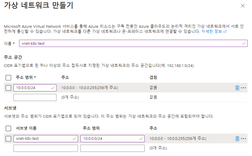 - 이름, 가상 네트워크의 주소 범위, 서브넷 이름, 서브넷 주소 범위 등에 대해 지정한 후 [확인]을 클릭하여 [가상 네트워크] 생성을 완료합니다.