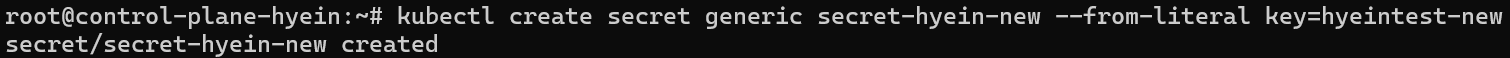 - kubectl create secret generic secret-hyein-new --from-literal key=hyeintest-new 명령어를 입력하여 secret을 생성합니다.