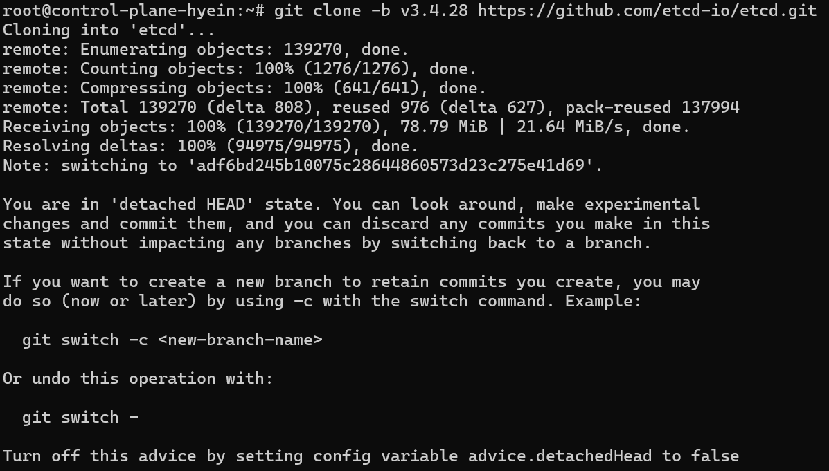 - ETCD repo를 다운로드하기 위해 git clone -b v3.4.28 https://github.com/etcd-io/etcd.git 명령어를 입력합니다.