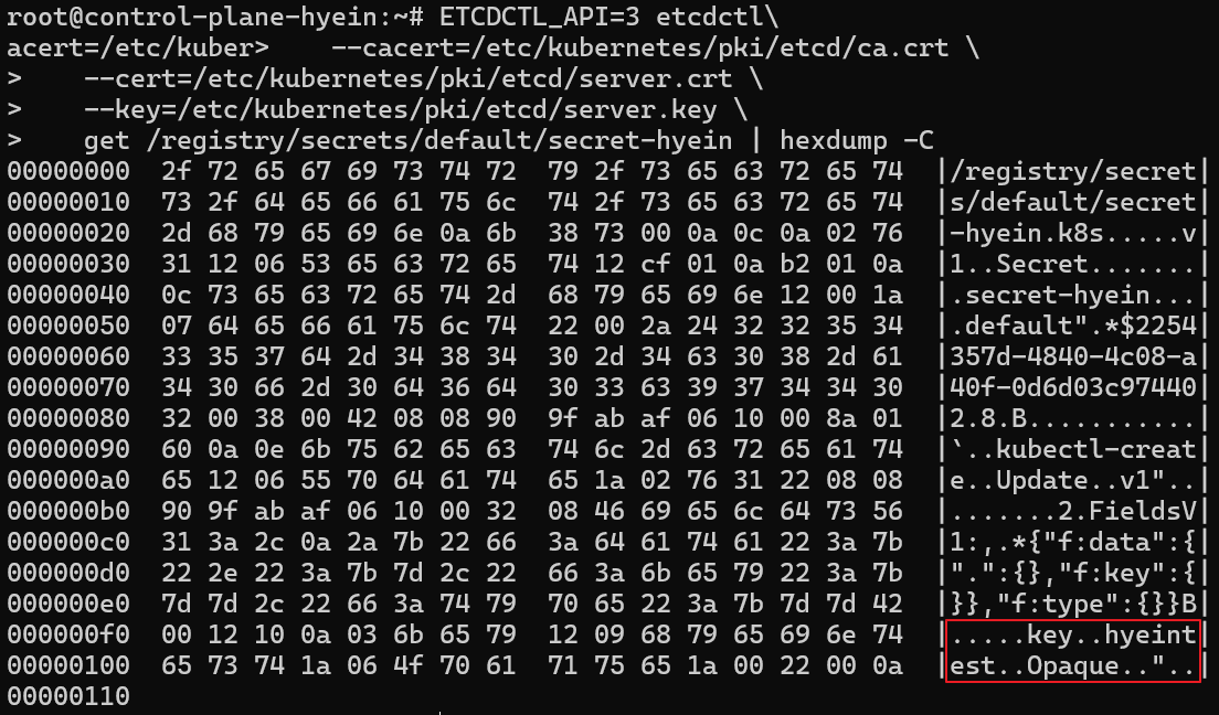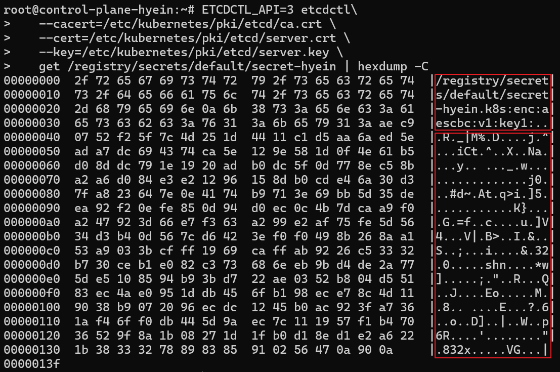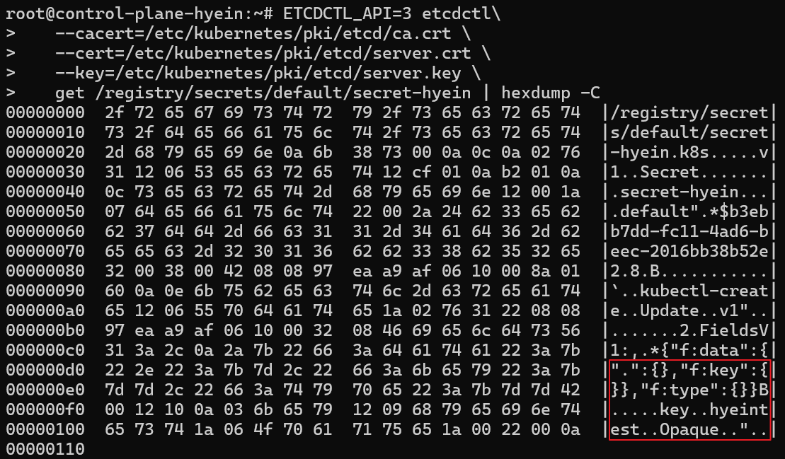 kubectl get secret secret-hyein -o yaml 명령어를 입력했을 때에는 적어도 base64로 인코딩된 형태로 존재했지만 ETCD에 저장된 데이터는 평문 그대로 저장된 것을 확인할 수 있습니다.