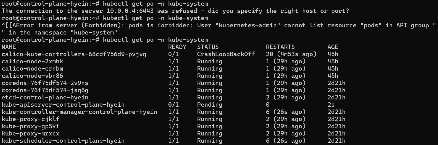 - 변경 사항을 한번 더 확인하고 저장하면 kubelet이 변경 사항을 자동으로 감지하여 kube-apiserver를 자동으로 재생성합니다. (재생성에는 시간이 소요되기 때문에 잠시 기다려야 합니다.)