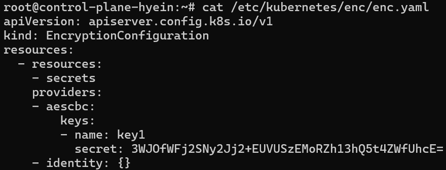 - 파일 작성이 완료되면 저장한 후 cat /etc/kubernetes/enc/enc.yaml 명령어를 입력하여 파일이 제대로 작성되었는지 확인합니다.