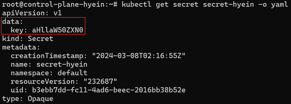 즉, kubectl get secrets secret-hyein -o yaml 명령어로 Secret에 저장된 데이터를 조회할 때에는