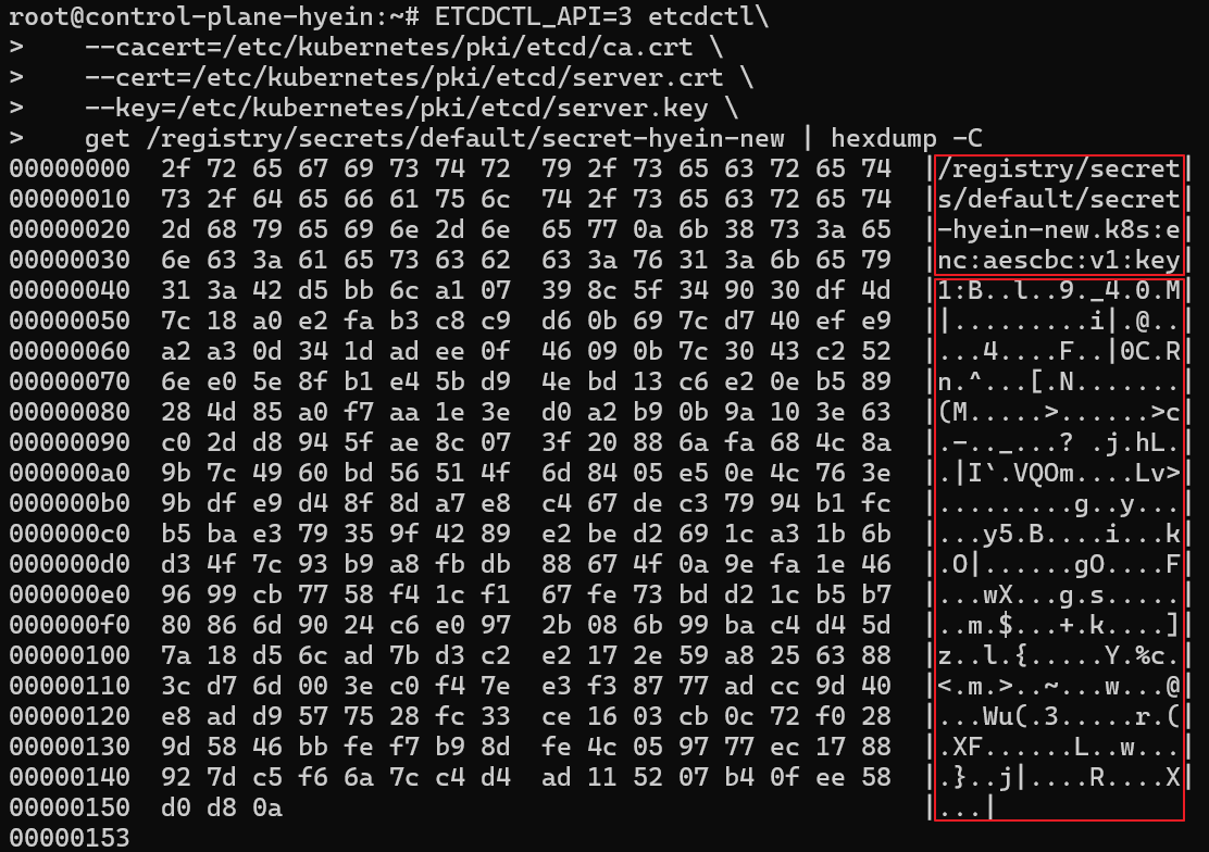 - 하기 스크린샷의 첫 번째 빨간 박스를 보면 provider가 Secret 데이터를 암호화했음을 보여주는 k8s:enc:aescbc:v1: 이라는 문구가 Secret 이름 뒤에 붙어 있음을 알 수 있습니다.