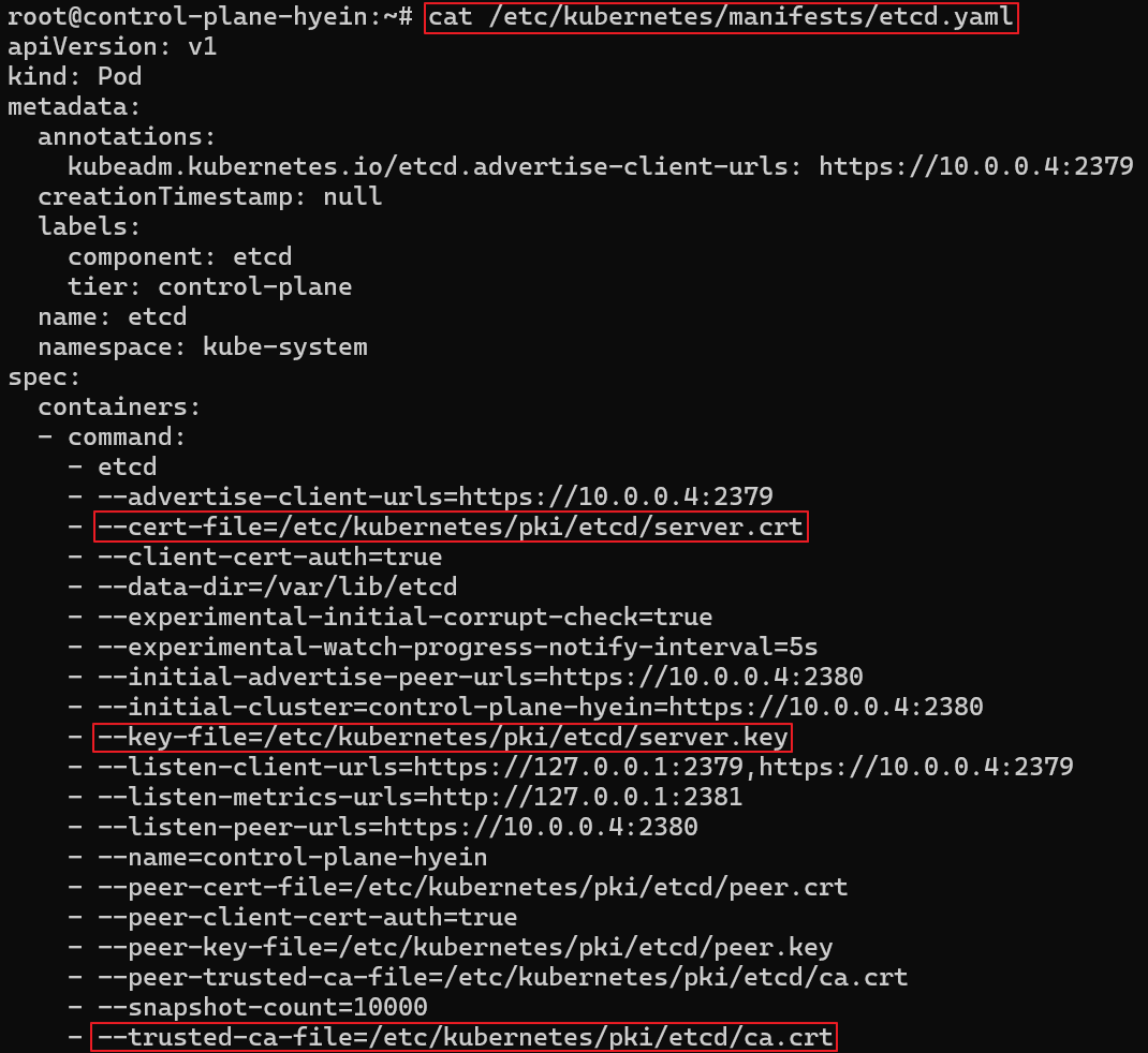 - cat /etc/kubernetes/manifest/etcd.yaml 명령어를 입력하여 필요한 값들에 대한 정보를 확인합니다.
