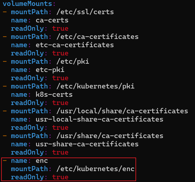 - spec.containers.command 하위의 flag들이 모여있는 곳에 --encryption-provider-config flag를 추가합니다.