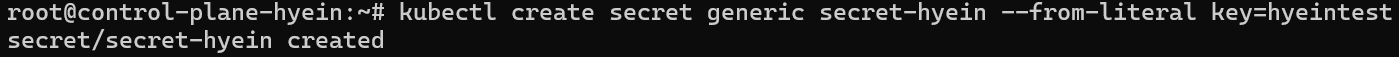 - kubectl create secret generic secret-hyein --from-literal key=hyeintest 명령어를 입력하여 secret을 생성합니다.