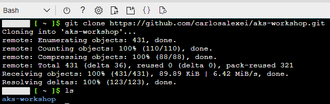git clone https://github.com/carlosalexei/aks-workshop.git 명령어를 사용하여 Cloud Shell에 소스 코드를 가지고 옵니다. 그후 ls를 입력하여 aks-workshop이라는 directory가 생성된 것을 확인합니다.