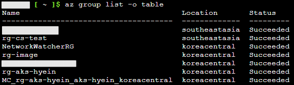 az group list -o table 명령어를 통해 현재 구독에 존재하는 리소스 그룹의 리스트를 테이블 형식으로 확인해 보겠습니다.