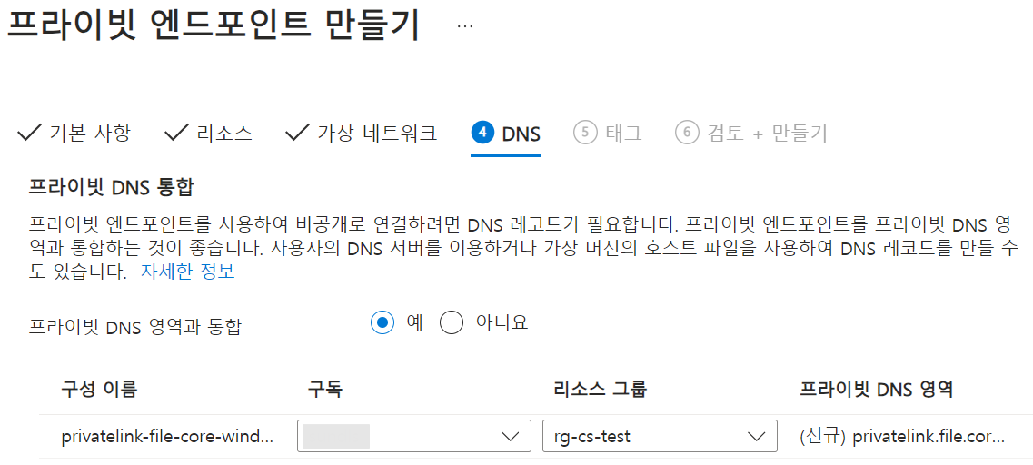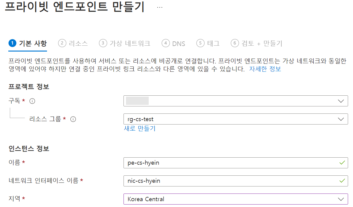 위와 같은 설정을 마무리한 후 [검토 + 만들기] 탭으로 이동하여 Private Endpoint 생성을 완료합니다.