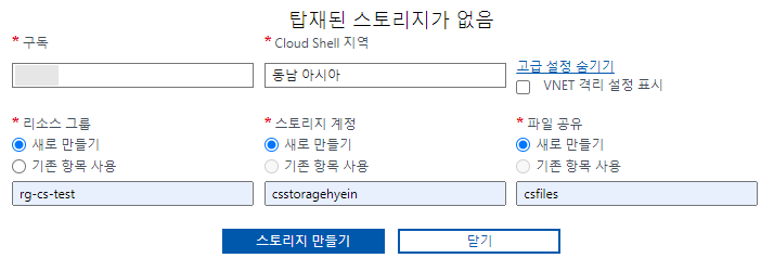 Cloud Shell을 사용하기 위해서는 새로운 Storage Account를 생성해야 합니다.