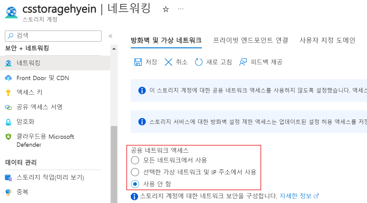 Azure Portal로 이동하여 [Storage Account] > [보안 + 네트워킹] > [네트워킹] 탭 > [방화벽 및 가상 네트워크]에서 공용 네트워크 액세스에 대한 옵션을 [사용 안 함]으로 변경합니다.