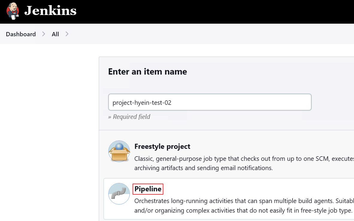 - Project 이름을 입력하고 Project 타입은 [Pipeline]을 선택합니다.