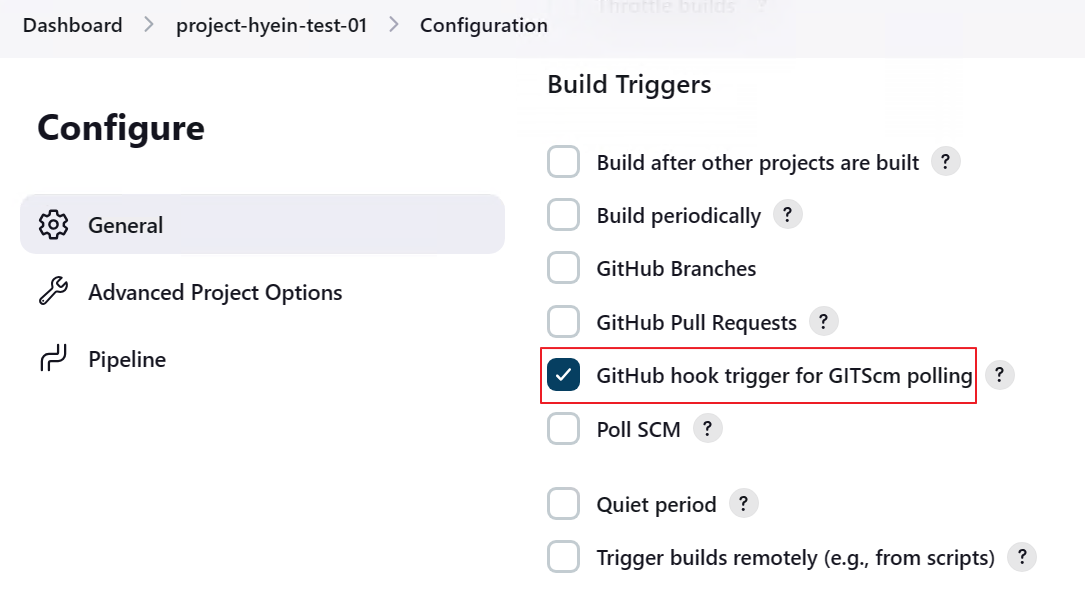 - Configure의 General 탭에서 Build Triggers 옵션 중 "GitHub hook trigger for GITScm polling"을 선택합니다.