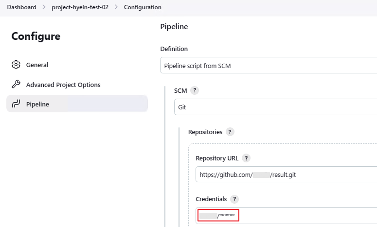 Repository URL은 결과값이 저장될 GitHub 레포지토리를 지정해 줍니다. (Credentials의 경우 이전에 설정한 것을 사용해도 무방합니다.)