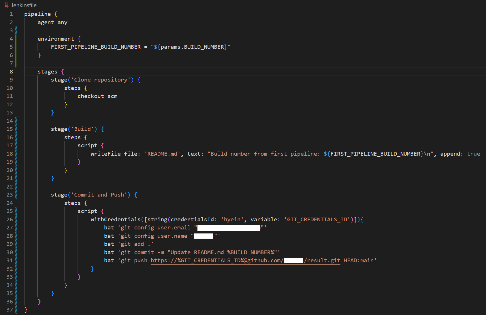 - Build stage에서 README.md 파일에 현재 Pipeline의 Build 번호를 추가하고 Commit and Push stage에서 이를 result라는 이름의 GitHub 레포지토리에 push합니다.