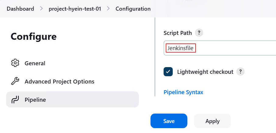 - 마지막으로 Configure의 Pipeline 탭에서 Script Path를 확인합니다.