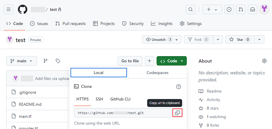 - Repository에 GitHub의 URL 주소를 입력합니다. (본 테스트의 경우 기존에 작성해 둔 Terraform 코드와 관련된 Repository를 사용합니다.)