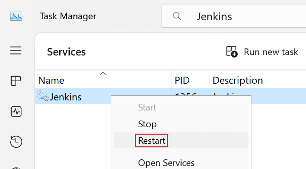 - Jenkins Service를 마우스 우클릭한 후 [Restart]를 눌러 Jenkins를 다시 실행합니다.