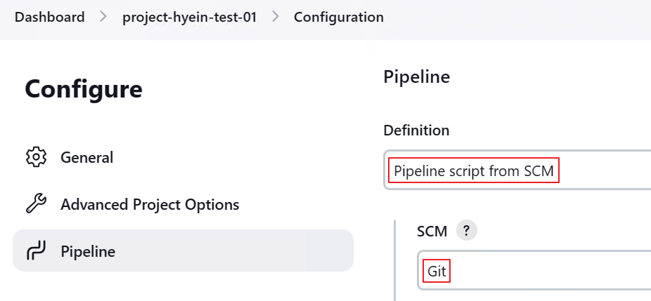 - Configure의 Pipeline 탭에서 Definition을 “Pipeline script from SCM”으로 변경합니다.