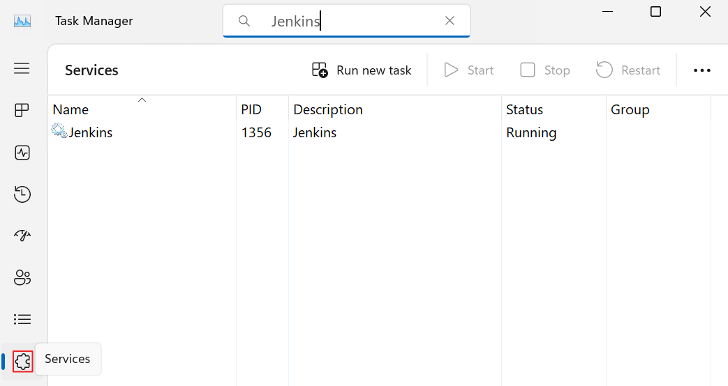 - Services 탭으로 이동하여 Jenkins를 검색합니다.