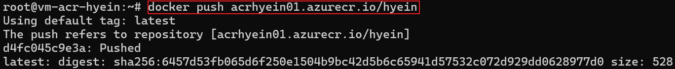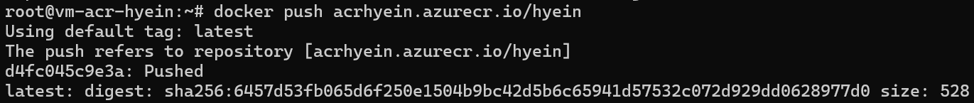 - docker push acrhyein.azurecr.io/hyein 명령어로 ACR에 push를 진행합니다.