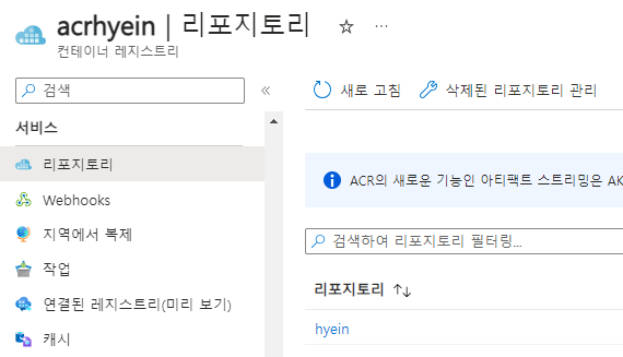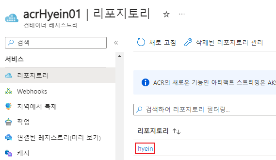 acrHyein01이라는 이름의 ACR에 컨테이너 이미지가 제대로 push된 것을 알 수 있습니다.
