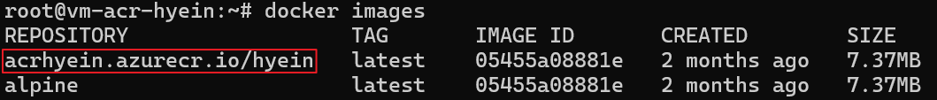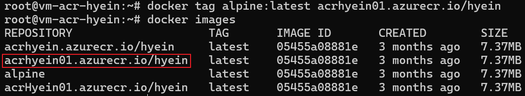 - 가상 머신에 빌드 되어 있는 alpine이라는 이미지에 대해 태그를 생성합니다. ( docker tag alpine:latest acrHyein01.azurecr.io/hyein )