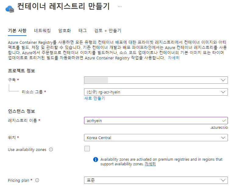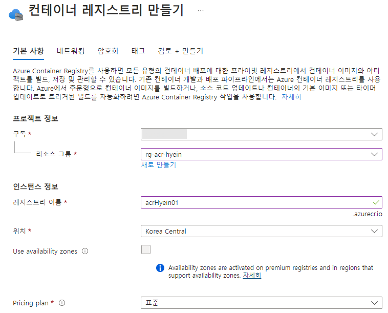 참고로, 컨테이너 레지스트리는 Azure 전역에서 고유한 이름이어야 합니다. (대소문자 구분 없음)