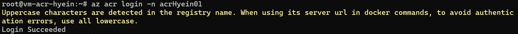 실제로 ACR에 로그인 시 서버 명을 모두 소문자로 한 후 로그인을 시도하면 하기와 같이 Login Succeeded라는 문구만 출력되는 것을 확인할 수 있습니다.