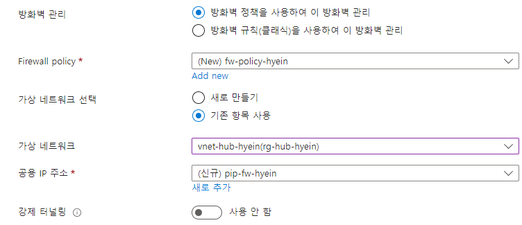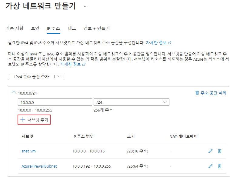 Hub 가상 네트워크에서 필요한 서브넷은 상기 스크린샷에서 볼 수 있듯이 2개입니다. (VM용, Azure Firewall용)