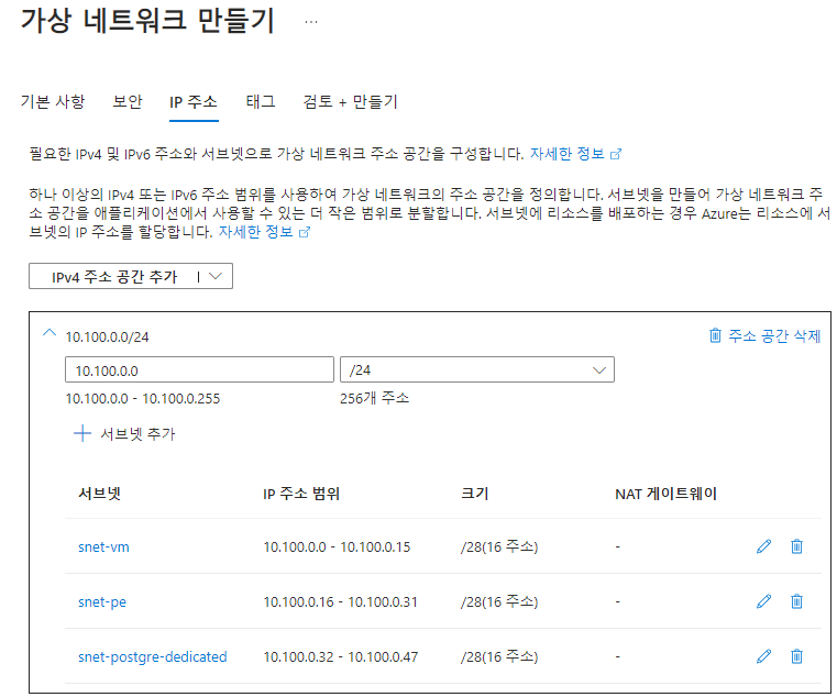 Spoke 가상 네트워크에서 필요한 서브넷은 상기 스크린샷에서 볼 수 있듯이 3개입니다. (VM용, Private Endpoint용, Azure Database for PostgreSQL에 대한 위임된 서브넷 용)