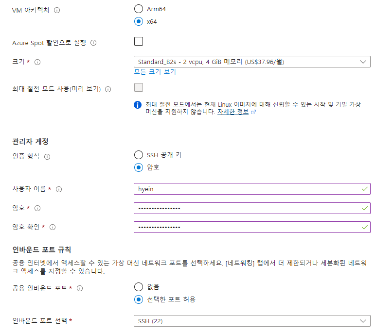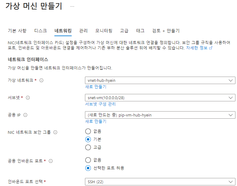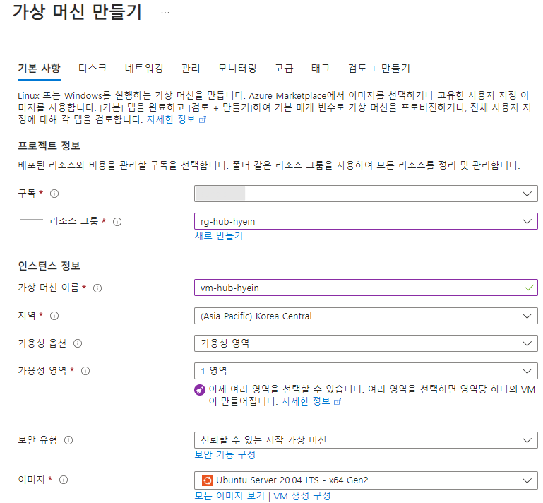 ※ 가상 머신 배포 과정은 Hub용, Spoke용 모두 동일합니다(리소스 그룹, 가상 네트워크/서브넷만 다르게 지정해 주면 됨).