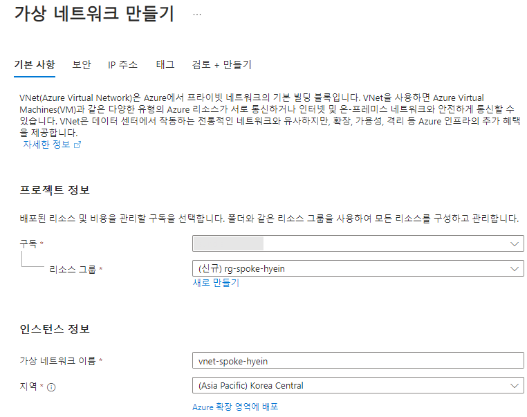 - Hub, Spoke 가상 네트워크 생성