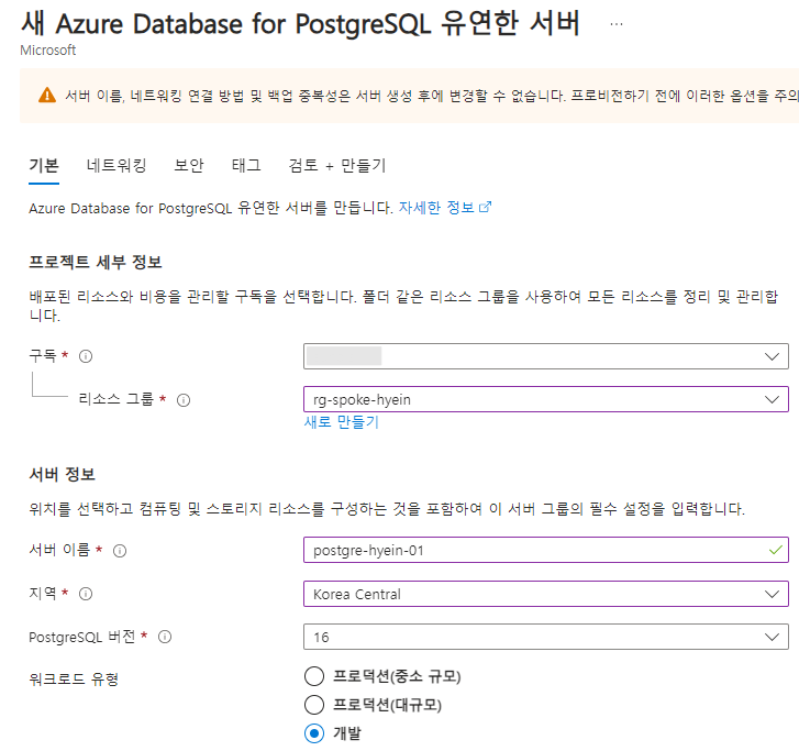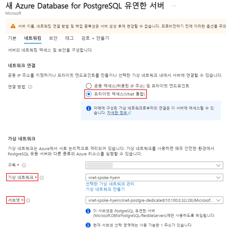해당 탭에서 snet-postgre-dedicated 서브넷을 Azure Database for PostgreSQL에 위임할 수 있으나 해당 리소스를 생성할 때 구성하도록 하겠습니다.