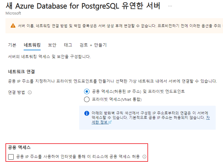[공용 액세스] 섹션에서 "공용 IP 주소를 사용하여 인터넷을 통해 이 리소스에 공용 액세스 허용"에 대한 체크 박스를 해제합니다.