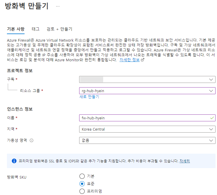 - [보안] 탭에서 Azure Firewall을 생성할 수 있지만 별도로 배포를 진행할 예정이기 때문에 해당 과정은 생략합니다.