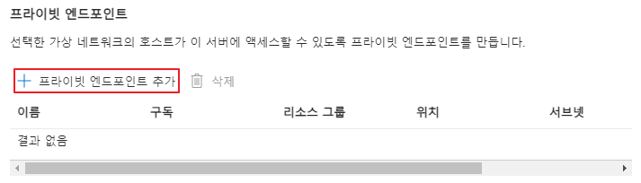 그다음 하단의 [프라이빗 엔드포인트] 섹션에서 [+ 프라이빗 엔드포인트]를 클릭하여 프라이빗 엔드포인트 생성을 진행합니다.