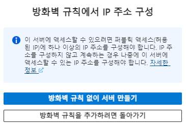 - [만들기] 버튼을 클릭하면 하기와 같은 창이 뜹니다. [방화벽 규칙 없이 서버 만들기] 버튼을 클릭하여 생성을 진행합니다. (이 부분은 구성할 필요가 없습니다.)