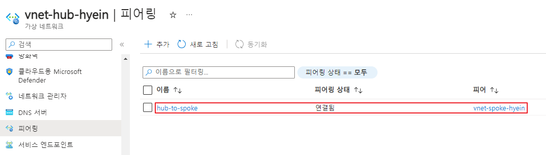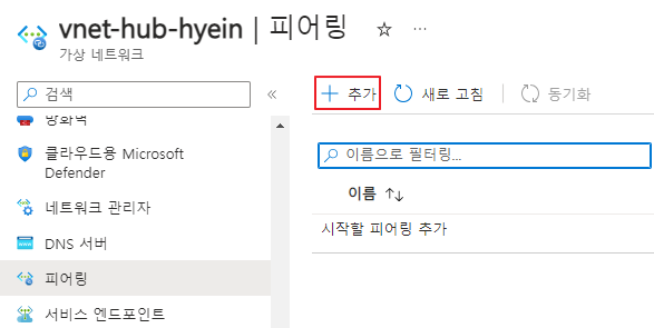 - [가상 네트워크] > [설정] > [피어링] 탭 > [+ 추가]