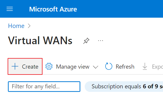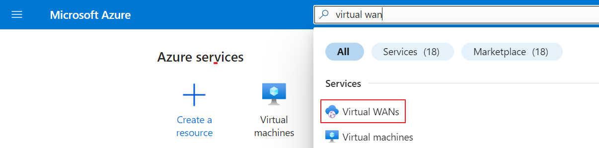 - Access the Azure Portal (https://portal.azure.com/) and search for Virtual WAN in the search bar at the top