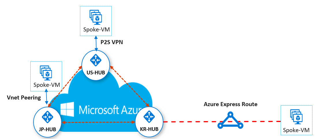 - Hub and Spoke architecture with scale and performance built in for branches (VPN/SD-WAN devices), users(Azure VPN/OpenVPN/IKEv2 clients), ExpressRoute circuits and virtual networks