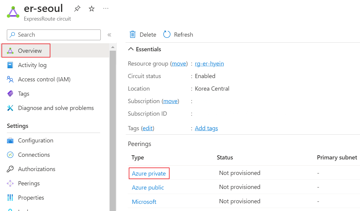- In the [Overview] tab, select the "Azure Private" in the Peering section