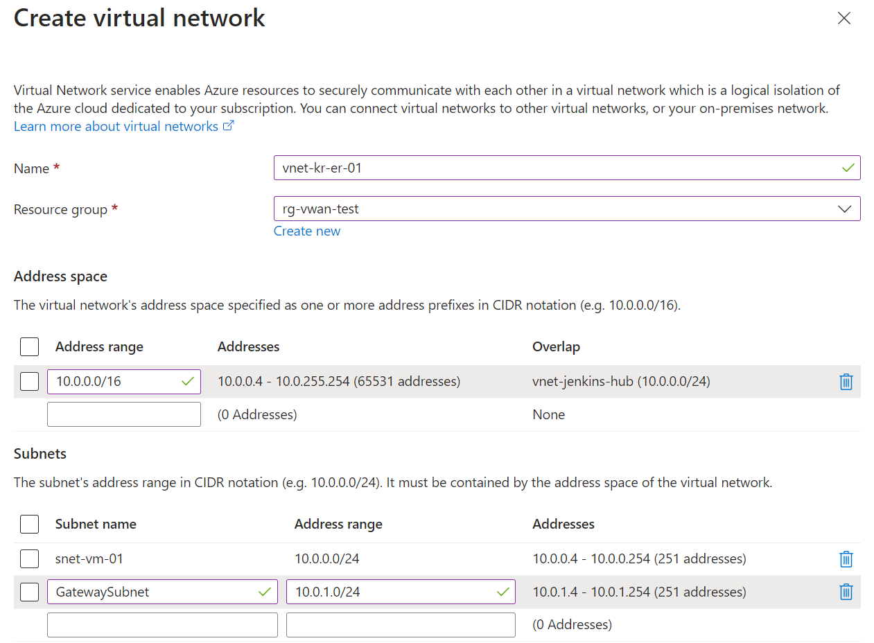 Virtual network : vnet-kr-er-01 # Click the [Create virtual network] button and create a new virtual network